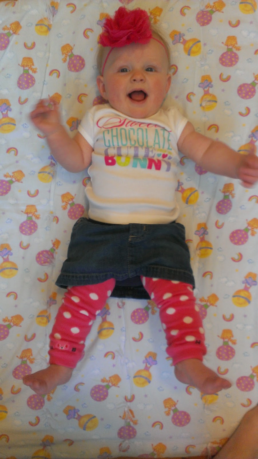 Some fun things she has done this month: continues to roll over from her back to her tummy, but still hasn’t gotten from her tummy to her back. This has become quite problematic in the middle of the night on more than one occasion. She ALWAYS wants to be sitting up on her own or be helped to stand. Laying down is just not much of an option anymore, which made our monthly pictures difficult. But it has made going for walks so much fun! She loves to sit upright in her stroller and see the world around her. She just sits there and babbles to herself while we walk. I love hearing her talk to herself. She has found another new love this week – peaches. The girl can’t get enough of them! She appears to have a thing for orange colored baby food. Nothing else seems to float her boat at this point. I’m guessing she weighs about 18 pounds now, give or take, but we will find out next week at her 6 month appointment (and shots. Yikes!) We are going to have to move to the next car seat soon, however, as her feet are just starting to hang over the one she is in now. Gotta love those long legs!!