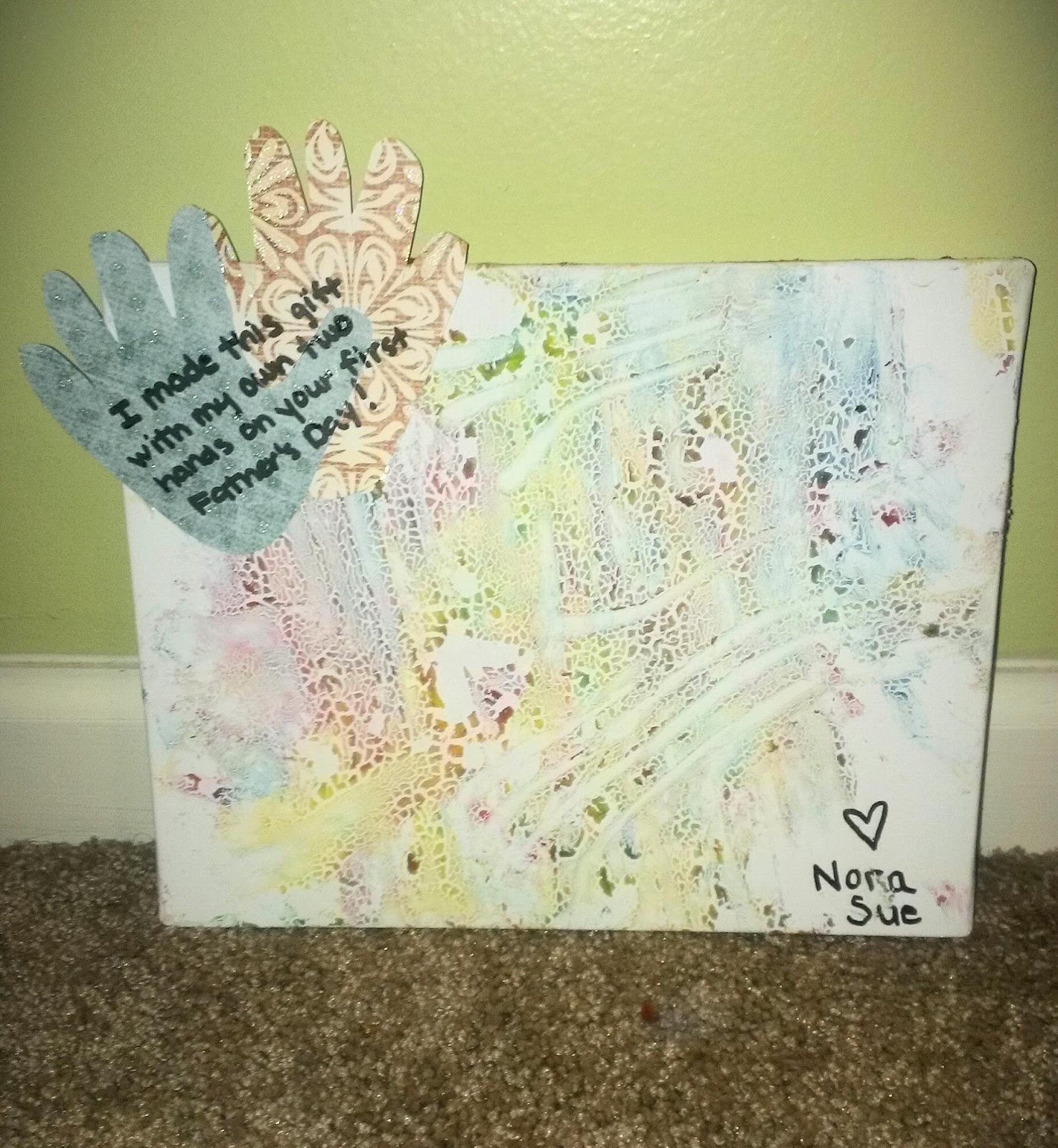 For Eric’s first Father’s Day, I wanted to have Nora make him something special. So I found this awesome baby goop recipe. Nora had an awesome time “creating her masterpiece” for Daddy. The only thing that I did differently from the original instructions was spray a generous coat of Elmer’s Spray Adhesive. It made the final product stay on the canvas much better. You can read about Eric’s first Father’s day here.
